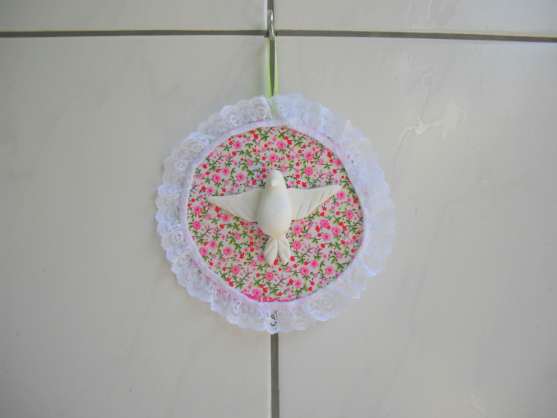 Sabe aquele pedacinho de retalho que geralmente vai pro lixo? E aqueles poucos centímetros de renda que quase não dá prá fazer nada? E aquela "bolinha" de massinha de biscuit tingida de branco que sobrou? E aquele cd "Axé Bahia 2003" que nunca mais foi ouvido??? Ahh, sem esquecer dos 6 cm de fitinha de cetim encontrada caída em algum cantinho do Atelier....juntei tudo e olha no que esse monte de nada se trasformou: